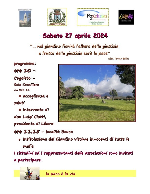 Cogoleto. Sabato 27 aprile sarà inaugurato uno spazio verde che diventerà il Giardino delle Vittime innocenti di tutte le mafie. Su suggerimento del Punto Pace Hélder Câmara di Pax Christi il Comune ha svolto infatti la procedura istituzionale per l’intitolazione. Il cosiddetto “villaggio olandese”, nei pressi di via Frankenbergen, ingloberà anche il Giardino della Convivialità delle Differenze e una delle due panchine dipinte in giallo, arancione e fucsia. Si estenderà dal Punto di Incontro Don Andrea Gallo fino a via del Mirto.