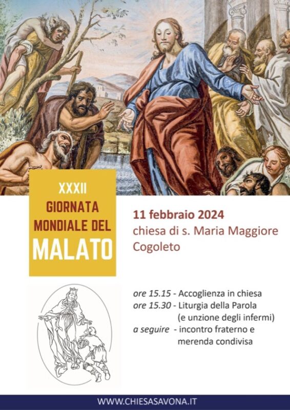 Cogoleto. Domenica 11 febbraio si terrà la XXXII Giornata Mondiale del Malato, istituita da Giovanni Paolo II nel 1992 nel giorno della memoria liturgica della Beata Maria Vergine di Lourdes. Il tema scelto da papa Francesco è “Non è bene che l’uomo sia solo. Curare il malato curando le relazioni”. Alle ore 15 nella Parrocchia Santa Maria Maggiore durante la Liturgia della Parola sarà amministrata l’unzione degli infermi. A seguire ci sarà un momento conviviale.