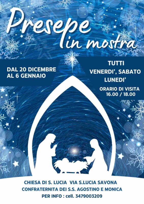 A Savona nella Chiesa Santa Lucia dal 20 dicembre al 6 gennaio ogni venerdì, sabato e lunedì dalle ore 16 alle 18 sarà possibile visitare il “Presepe in mostra”, promosso dalla Confraternita Santi Agostino e Monica. Per ulteriori informazioni si può chiamare il numero di telefono 3479003209.
