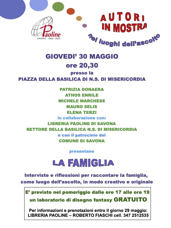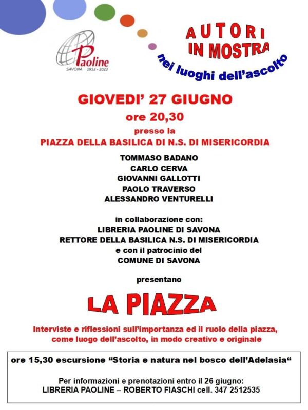 Savona. Con il patrocinio del Comune e in collaborazione con Opere Sociali N. S. di Misericordia ogni giovedì dal 30 maggio al 4 luglio dalle ore 20:30 alle 23 in piazza Santuario, nell’omonima frazione, la Libreria Paoline organizza il ciclo di serate culturali “Autori in mostra nei luoghi dell’ascolto”. In questi incontri interverranno alcuni fra i settanta autori e artisti che hanno aderito al progetto di partecipazione culturale attiva della libreria. Con prenotazione entro il giorno precedente telefonando a Roberto Fiaschi al numero 3472512535 si potrà partecipare alle escursioni con Paola Bussino e ai laboratori di disegno fantasy gratuiti con Elena Terzi.