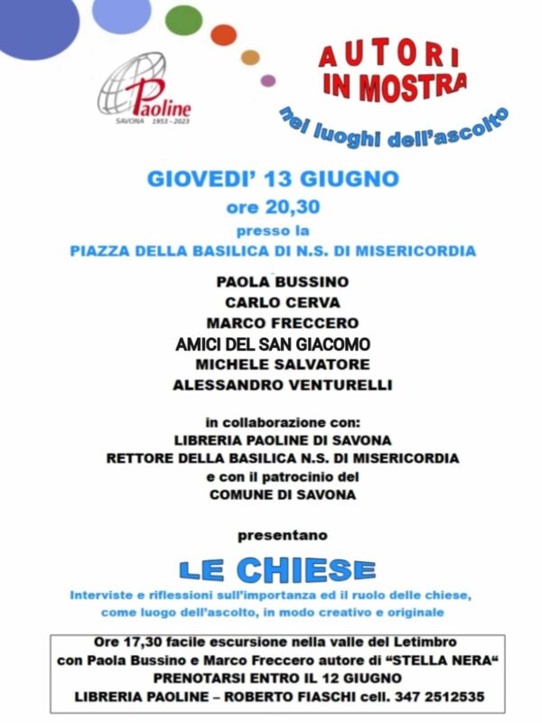 Savona. Con il patrocinio del Comune e in collaborazione con Opere Sociali N. S. di Misericordia ogni giovedì dal 30 maggio al 4 luglio dalle ore 20:30 alle 23 in piazza Santuario, nell’omonima frazione, la Libreria Paoline organizza il ciclo di serate culturali “Autori in mostra nei luoghi dell’ascolto”. In questi incontri interverranno alcuni fra i settanta autori e artisti che hanno aderito al progetto di partecipazione culturale attiva della libreria. Con prenotazione entro il giorno precedente telefonando a Roberto Fiaschi al numero 3472512535 si potrà partecipare alle escursioni con Paola Bussino e ai laboratori di disegno fantasy gratuiti con Elena Terzi.