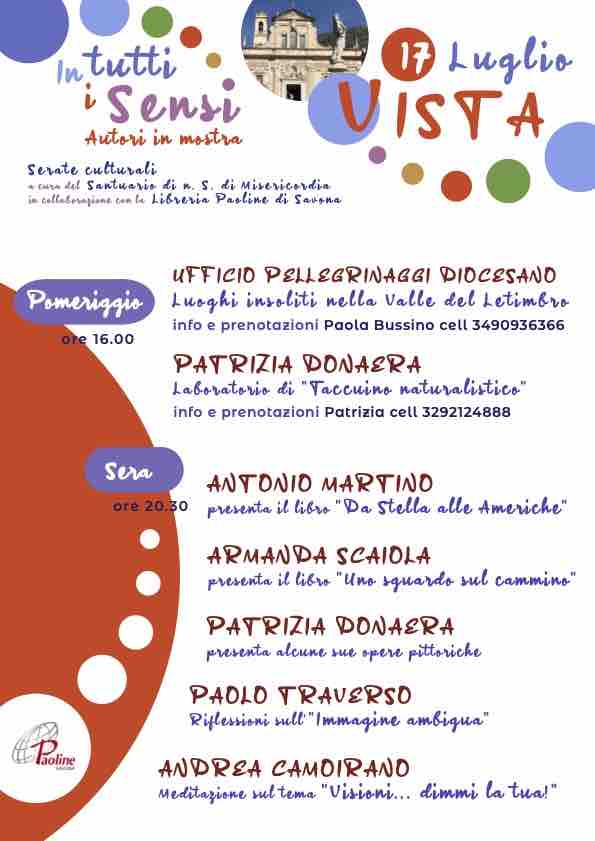 Savona. Continuano con successo le serate del progetto culturale “Autori in mostra” del Santuario Nostra Signora di Misericordia in collaborazione con la Libreria Paoline. Lunedì 17 luglio scopriremo il “Senso della Vista”, la capacità di vedere la realtà con i nostri occhi sapendo che spesso il pregiudizio impedisce una visione oggettiva.