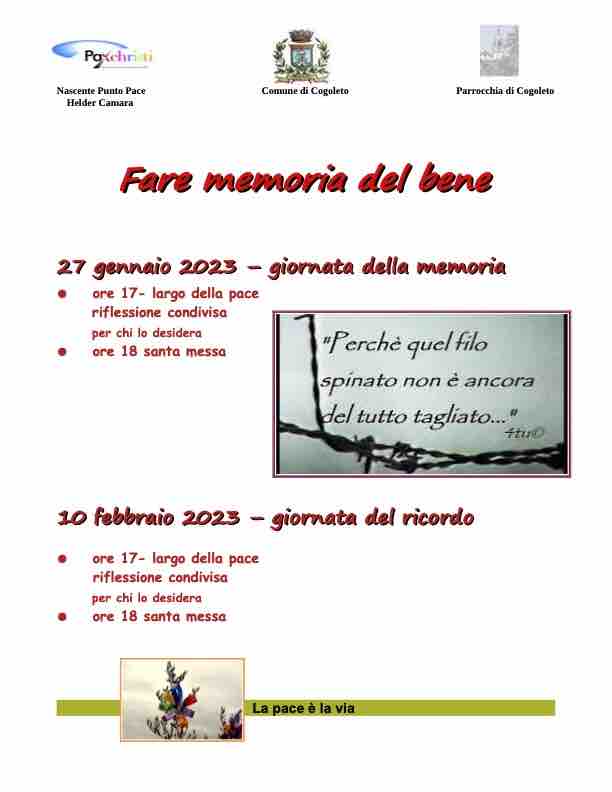 A Cogoleto venerdì 27 gennaio Pax Christi, la Parrocchia Santa Maria Maggiore e il Comune organizzerà la manifestazione “Fare memoria del bene”: in programma alle 17 in largo della Pace una riflessione condivisa e alle 18 la santa messa. I due momenti saranno replicati il 10 febbraio in occasione del Giorno del ricordo, per ricordare le vittime delle foibe e l’esodo degli istriani, dei fiumani e dei dalmati nel Secondo Dopoguerra.