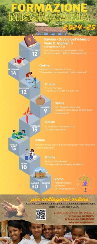 In preparazione e in seguente concomitanza con l’anno del venticinquesimo giubileo universale ordinario Chiesa cattolica (2025) le Figlie di Nostra Signora della Neve promuovono un ciclo di incontri di formazione che tratteranno il tema della missione da più punti di vista. Il primo sarà sabato 12 ottobre alle ore 10:30 presso la Scuola dell’Infanzia Nostra Signora della Neve e Regina Margherita, in viale Dante Alighieri 3, al Prolungamento di Savona con il docente genovese don Gianfranco Calabrese, il quale parlerà de “Il fondamento biblico della missione” (accoglienza alle 9:30).