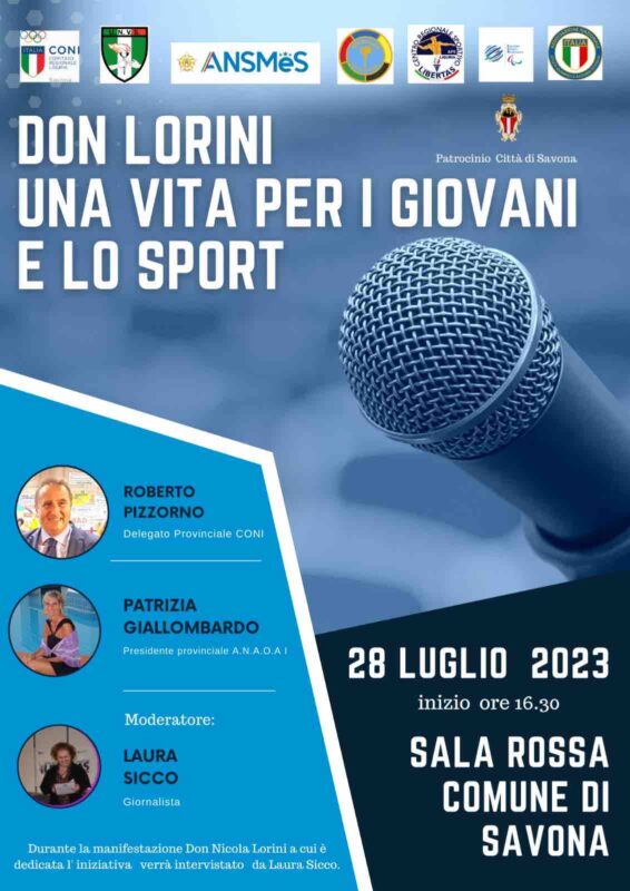 Con il patrocinio della Città di Savona venerdì 28 luglio alle ore 16:30 nella Sala Rossa del Municipio si svolgerà il convegno “Don Lorini: una vita per i giovani e lo sport” promosso dal CONI.