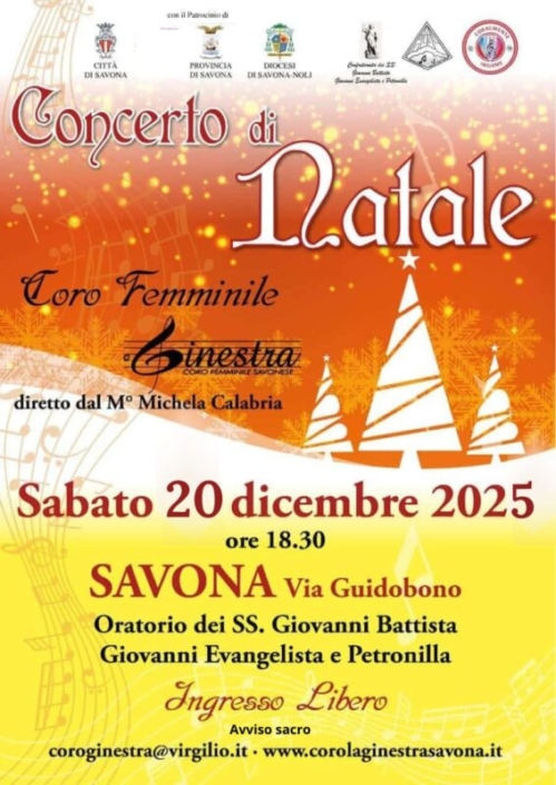 Savona. Sabato 20 dicembre alle ore 18:30 all’Oratorio Santi Giovanni Battista, Giovanni Evangelista e Petronilla, in via Bartolomeo Guidobono, il Coro Femminile La Ginestra, diretto dal maestro Michela Calabria, si esibirà nel “Concerto di Natale”. L’evento gode del patrocinio della Diocesi di Savona-Noli, del Comune, della Provincia e della locale confraternita.
