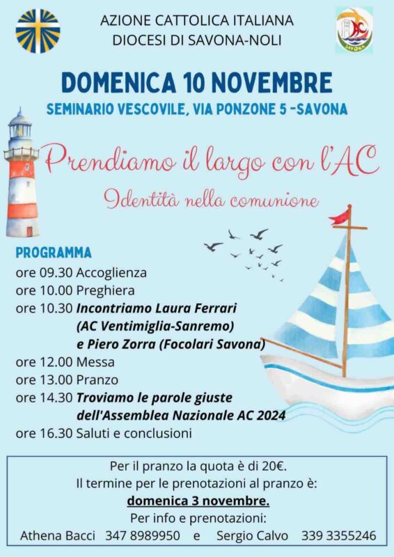 Savona. Domenica 10 novembre dalle ore 9:30 alle 16:30 nel Seminario Vescovile, in via Leopoldo Ponzone 5, l’Azione Cattolica diocesana organizza una giornata aperta a tutti sul tema “Prendi il largo con l’AC, identità nella comunione”. Dopo l’accoglienza il programma prevede la preghiera di apertura, un’intervista doppia a Laura Ferrari dell’Azione Cattolica della Diocesi di Ventimiglia-Sanremo e Piero Zorra dei Focolari, che ci permetterà di mettere a confronto i loro percorsi nelle proprie realtà associative.