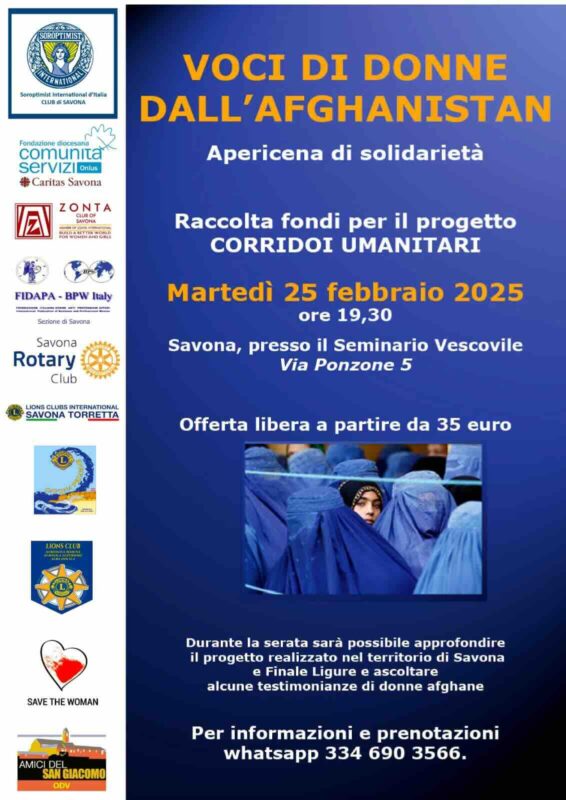 Savona. Martedì 25 febbraio dalle ore 19:30 il Seminario Vescovile, in via Leopoldo Ponzone 5, ospiterà l’apericena solidale “Voci di donne dall’Afghanistan” per raccogliere fondi da destinare al progetto “Corridoi Umanitari”. Durante la serata sarà possibile approfondire il progetto realizzato nel territorio di Savona e Finale Ligure e ascoltare alcune testimonianze di donne afghane.
