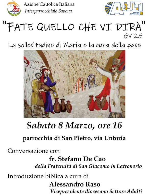 Savona. Sabato 8 marzo alle ore 16 presso la Parrocchia San Pietro Apostolo, in via Untoria 6, l’Azione Cattolica Interparrocchiale organizza l’incontro “‘Fate quello che vi dirà (Gv 2,5)’ – La sollecitudine di Maria e la cura della pace”.