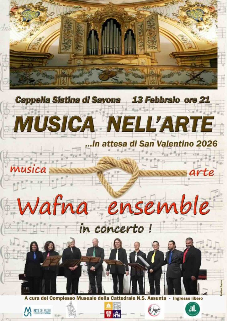 Savona. Anche quest’anno, in attesa della “festa di san Valentino”, il Complesso Museale della Cattedrale offrirà alla comunità un evento musicale e artistico. Venerdì 13 febbraio alle ore 21 nella Cappella Sistina si esibirà il Wafna Ensemble dell’Accademia Musicale Teresiana, con un ricco programma declinato sulle antiche sonorità che valorizzeranno pienamente l’arte del monumento roveresco.