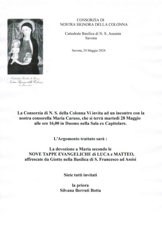 Savona. Martedì 28 maggio alle ore 16 nell’ex Sala Capitolare della Cattedrale Basilica Nostra Signora Assunta, in piazza del Duomo, la Consorzia Nostra Signora della Colonna invita ad un incontro con la consorella Maria Caruso su “La devozione a Maria secondo le nove tappe evangeliche di Luca e Matteo affrescate da Giotto nella Basilica San Francesco ad Assisi”.