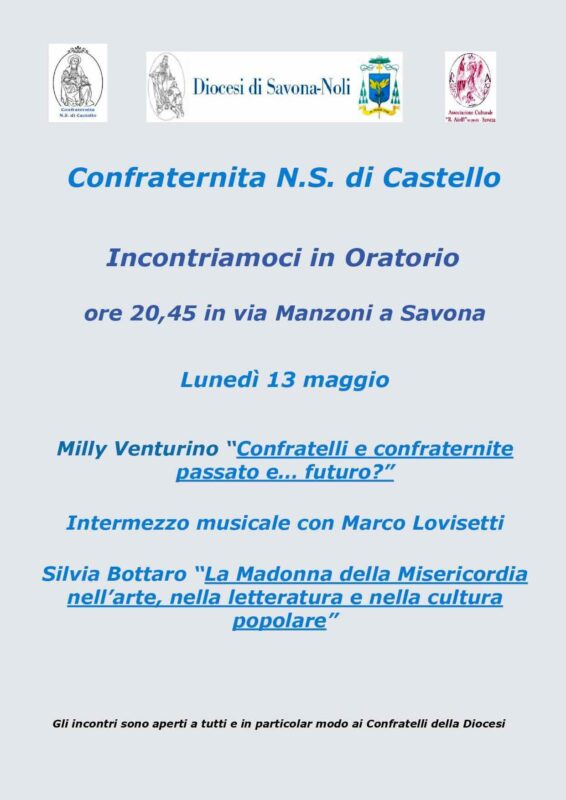 Lunedì 13 maggio alle ore 20:45 nell’Oratorio Nostra Signora di Castello, in via Alessandro Manzoni, nel centro storico, Maria Angela Venturino, detta Milly, dell’Arciconfraternita Santissima Trinità, parlerà di “Confratelli e confraternite: passato e… futuro?”.
