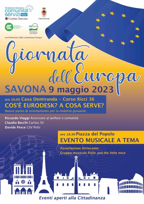 Savona. In occasione della Giornata dell’Europa e con il patrocinio del Comune martedì 9 maggio alle ore 18:30 in piazza del Popolo la Fondazione ComunitàServizi, ente gestore dei servizi caritativi diocesani, organizza un evento musicale a tema, animato dall’associazione Artincanto e dal gruppo musicale Pulin and The Little Mice.