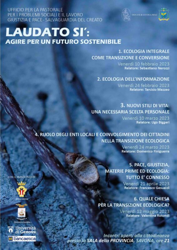 Savona. Venerdì 10 marzo alle ore 21 al Palazzo della Provincia, in via dei Sormano, Ugo Biggeri, presidente di Banca Popolare Etica, parlerà dei “Nuovi stili di vita: una necessaria scelta personale” in una conferenza nell’ambito del corso di formazione “Laudato sì: agire per un futuro sostenibile”, promosso dall’Ufficio Pastorale per i Problemi sociali, il Lavoro, la Giustizia, la Pace e la Salvaguardia del creato della Diocesi di Savona-Noli.
