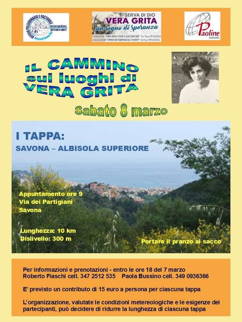 Alle 9:30 circa partirà la prima tappa de “Il cammino sui luoghi di Vera Grita” da Savona ad Albisola Superiore. Per il secondo anno consecutivo le escursioni percorreranno i luoghi significativi della breve vita terrena della Serva di Dio. La prima tappa sarà lunga 10 km e presenterà un dislivello di 300 m. Valutate le condizioni metereologiche e le esigenze dei partecipanti, gli organizzatori possono decidere di ridurre la lunghezza di ciascuna tappa. È previsto un contributo di 15 € a persona e occorre portare il pranzo al sacco.