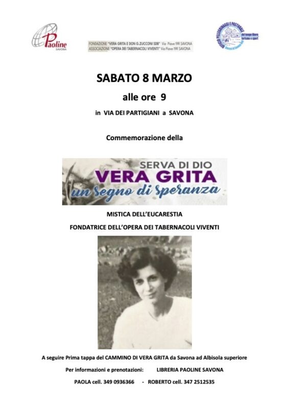 In occasione della Giornata Internazionale della Donna sabato 8 marzo la Libreria Paoline, la Fondazione Vera Grita e don Gabriello Zucconi, l’Associazione Opera dei Tabernacoli Viventi di Savona e il Servizio Pellegrinaggi e per la Pastorale del Tempo Libero, del Turismo e dello Sport della Diocesi di Savona-Noli organizzano l’evento “Serva di Dio Vera Grita, un Segno di Speranza” per ricordare la salesiana cooperatrice savonese, fondatrice dell’Opera dei Opera dei Tabernacoli Viventi, mistica dell’Eucarestia e insegnante di scuola in corso di beatificazione.