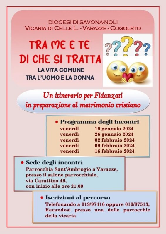 La Vicaria di Albisola e Varazze organizza il ciclo per fidanzati in preparazione al matrimonio cristiano dal titolo “Tra me e te di che si tratta? La vita comune tra l’uomo e la donna”.