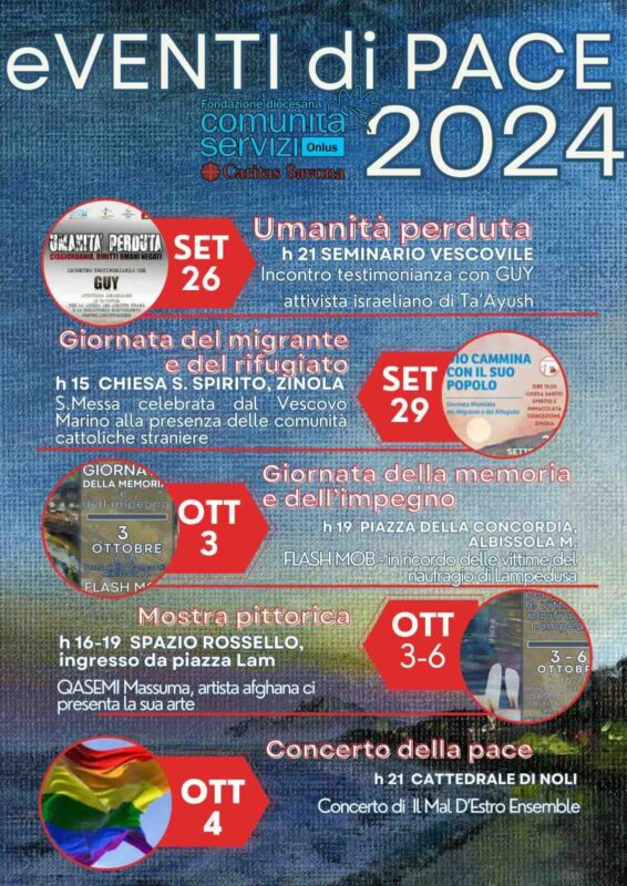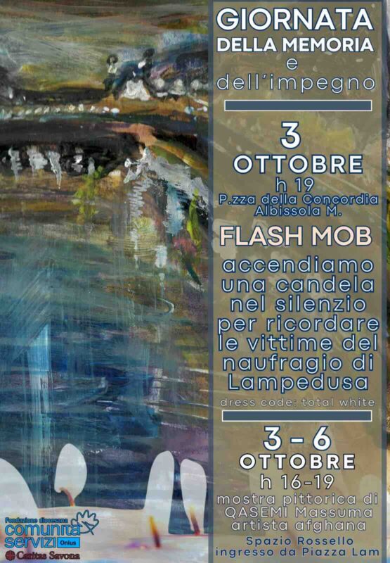Proseguono gli “eVenti di Pace” promossi dalla Fondazione Diocesana Comunità Servizi e dalla Caritas della Diocesi di Savona-Noli. Giovedì 3 ottobre sarà la Giornata della Memoria e dell’Impegno: alle ore 19 in piazza della Concordia ad Albissola Marina ci sarà un flashmob per commemorare il naufragio di Lampedusa del 2013. La tragedia provocò 368 morti accertati e circa 20 dispersi presunti, numeri che la pongono come una delle più gravi catastrofi marittime nel Mediterraneo dall’inizio del XXI secolo.
