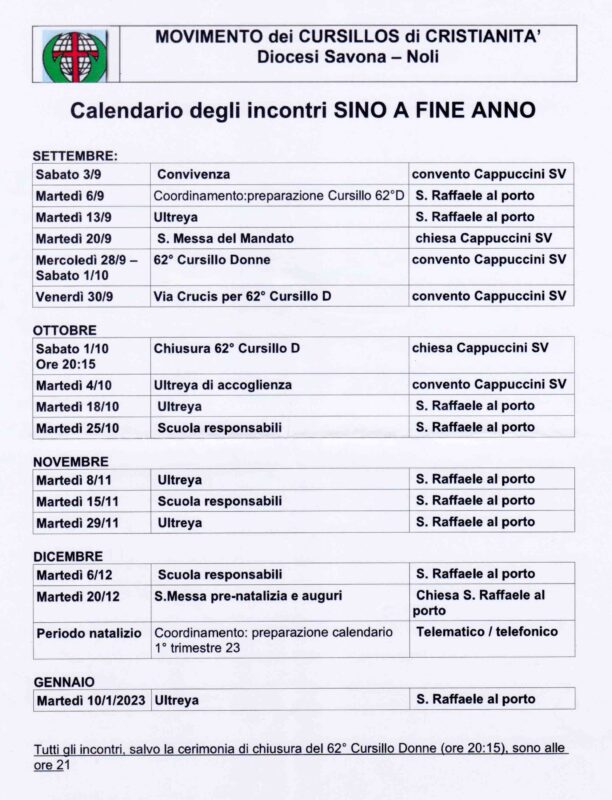 Savona. Da mercoledì 28 settembre a sabato 1 ottobre presso il Convento dei Frati Minori Cappuccini, in via san Francesco d’Assisi 16, nel quartiere Villetta, avrà luogo il 62esimo Cursillo Donne del Movimento dei Cursillos di Cristianità, fondato nel 1944 in Spagna da Eduardo Bonnin. Tra le celebrazioni in programma la Via Crucis.