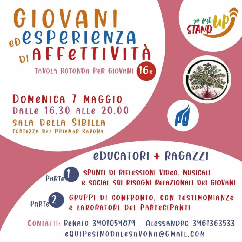 Savona. Domenica 7 maggio dalle ore 16:30 alle 20 nella Sala della Sibilla della Fortezza del Priamar si svolgerà la tavola rotonda “Giovani ed esperienze di affettività”, promossa dall’Équipe del Sinodo Diocesano in collaborazione con l’Ufficio per la Pastorale Giovanile.