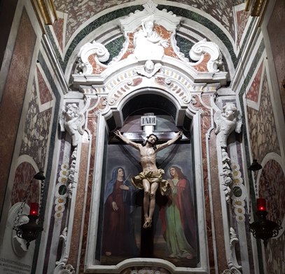 “Anticamente questo Cristo del Maragliano andava in processione, ma poi fu montato su un’altra croce, che infatti non è quella originale e risulta poco idonea, e collocato nella cappella, anch’essa oggetto di restauro che ho realizzato con la collaborazione di Annita Maggi – conclude Mezzano – oltre al consolidamento e alla pulitura dei marmi e dei finti marmi e il ritocco pittorico delle lacune, si è intervenuti anche sull’affresco della nicchia, realizzato dal Bongio nel 1807, raffigurante la Vergine e san Giovanni, che presentava danni dovuti a infiltrazioni dal tetto della cappella: è stato fatto un lavoro di risanamento profondo degli strati preparatori e di ripristino della pellicola pittorica”.