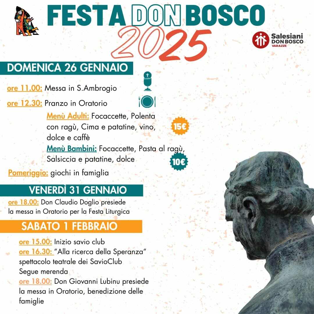 Venerdì 31 gennaio alle ore 18 nello stesso oratorio il parroco don Claudio Doglio presiederà la messa della memoria liturgica. Sabato 1 febbraio ancora in oratorio alle 15 inizierà il Savio Club, che alle 16:30 metterà in scena lo spettacolo teatrale “Alla ricerca della Speranza”. Seguiranno la merenda e alle 18 la messa presieduta da don Giovanni Lubinu e la benedizione delle famiglie.