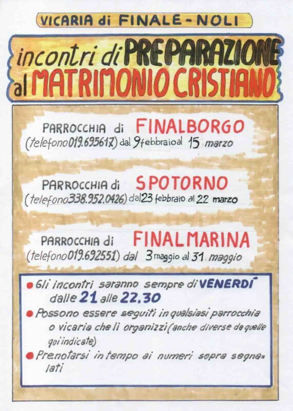Dopo la Vicaria di Albisola e Varazze, con il ciclo “Tra me e te di che si tratta? La vita comune tra l’uomo e la donna”, anche quella di Finale Ligure e Noli promuove una serie di incontri per fidanzati in preparazione al matrimonio cristiano.