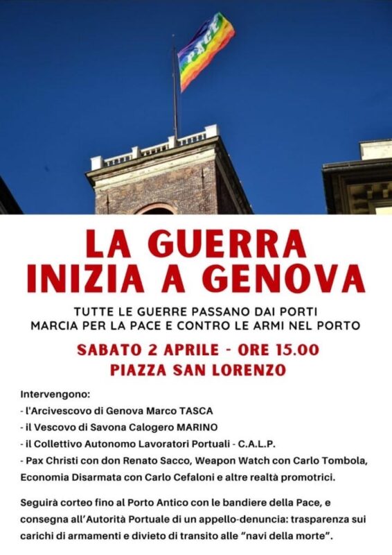 Genova. Sabato 2 aprile dalle ore 15 da piazza san Lorenzo si terrà “Fari di pace. La guerra inizia a Genova”, la “Marcia per la pace e contro le armi nel porto” promossa da Pax Christi Italia in collaborazione con l’Arcidiocesi di Genova e la Diocesi di Savona-Noli e con un largo fronte di associazioni ecclesiali e laiche. La manifestazione sarà aperta dai saluti istituzionali dell’arcivescovo Marco Tasca e di monsignor Calogero Marino e proseguirà con la consegna e firma della bandiera della pace, la testimonianza del Collettivo Autonomo Lavoratori Portuali e gli interventi dei rappresentanti di Pax Christi, Weapon Watch ed Economia Disarmata.
