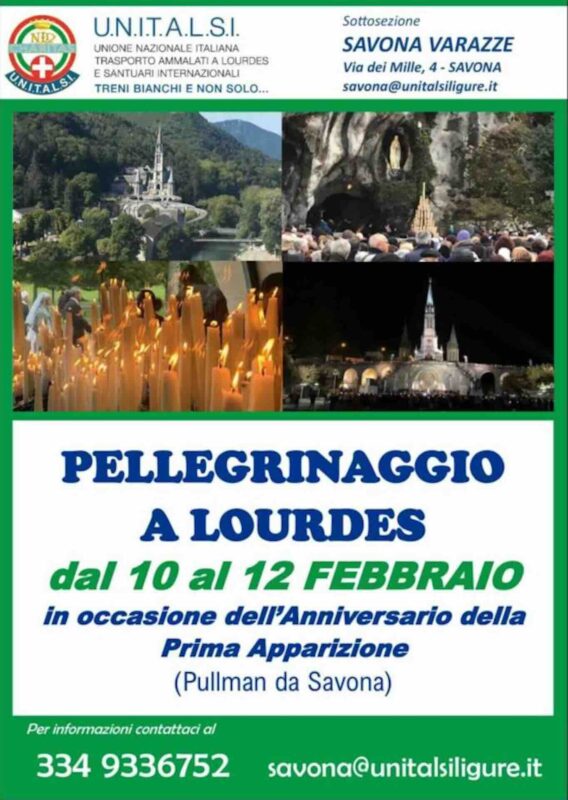 Dal 10 al 12 febbraio la Sottosezione Savona Varazze dell’UNITALSI organizza un pellegrinaggio al Santuario Nostra Signora di Lourdes in occasione del 165esimo anniversario delle apparizioni mariane nella grotta di Massabielle a Bernadette Soubirous (1858) e del 120esimo della fondazione dell’associazione stessa.