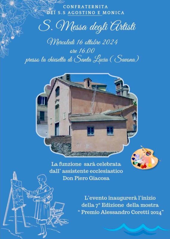 Mercoledì 16 ottobre alle ore 16 nella Chiesa Santa Lucia a Savona don Piero Giacosa celebrerà la messa dedicata a tutti gli artisti e alle artiste che operano nella diocesi di Savona-Noli. Nell’occasione sarà possibile consegnare un’opera di pittura, scultura o altro sul tema “Il mare (e la fede cristiana)” per partecipare alla settima Mostra “Premio Alessandro Coretti” (iscrizione 10 €). Per ulteriori informazioni occorre rivolgersi al direttore artistico e curatore Felicino Vaniglia. Il pubblico potrà poi ammirare le opere in concorso e votarle su apposita scheda.