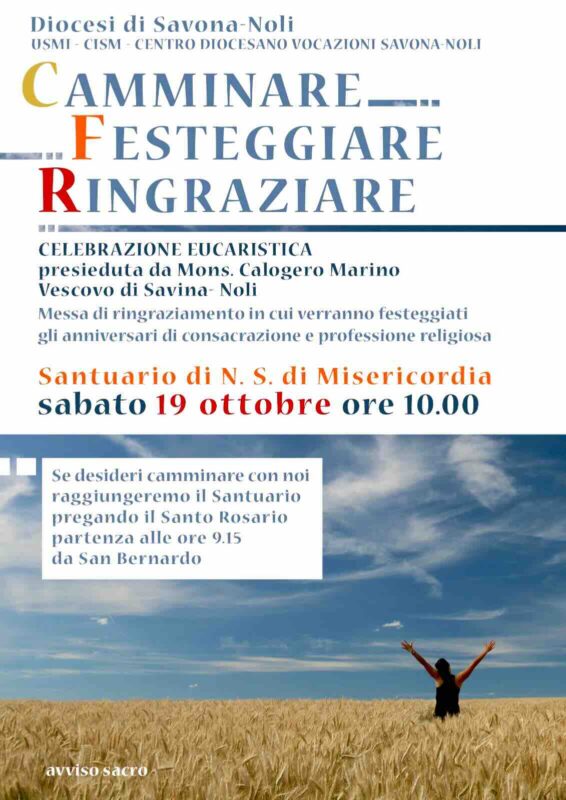 Sabato 19 ottobre alle ore 10 al Santuario Nostra Signora di Misericordia il vescovo Calogero Marino presiederà una messa di ringraziamento in cui verranno festeggiati gli anniversari di consacrazione e professione religiosa. L’iniziativa avrà per titolo “Camminare. Festeggiare. Ringraziare” ed è promossa dall’Unione Superiore Maggiori d’Italia, dalla Conferenza Italiana dei Superiori Maggiori e dal Centro Diocesano Vocazioni. Chi desidera recarsi alla basilica in pellegrinaggio in gruppo e recitando il rosario il ritrovo sarà alle ore 9:15 dalla frazione San Bernardo in Valle.