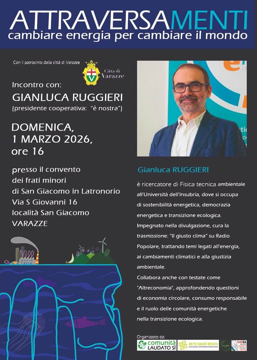 Varazze. Domenica 1 marzo alle ore 16 nel Convento San Giacomo in Latronorio dei Frati Minori, in via san Giovanni 16, in località San Giacomo, si terrà l’incontro “Cambiare energia per cambiare il mondo” con Gianluca Ruggeri, presidente della cooperativa È Nostra e autore del libro “Le energie del mondo. Fossile, nucleare, rinnovabile: quello che dobbiamo sapere”, edito da Laterza.