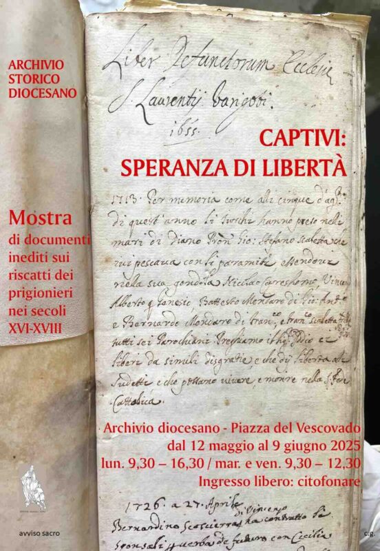 Savona. Proseguono le iniziative della Diocesi di Savona-Noli sotto il titolo “Al servizio della speranza” e legate alle Giornate di valorizzazione del patrimonio culturale ecclesiastico, promosse dalla Conferenza Episcopale Italiana. Dal 12 maggio al 9 giugno presso l’Archivio Storico diocesano sarà visitabile la mostra documentaria “Captivi: speranza di libertà”.