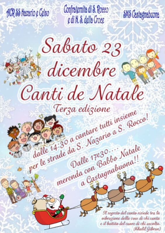 Varazze. Sabato 23 dicembre a Castagnabuona la Confraternita San Rocco e Nostra Signora della Croce organizza un pomeriggio di festa. Dalle ore 14:30 circa si percorreranno le borgate della frazione con i bambini dell’Azione Cattolica Ragazzi della Parrocchia Santi Nazario e Celso, eseguendo canti di Natale, facendo visita agli anziani e portando loro gli auguri per le festività. Arrivati in piazza, in collaborazione con la locale società di mutuo soccorso ci sarà una merenda per attendere l’arrivo di Babbo Natale, che porterà doni ai bambini.