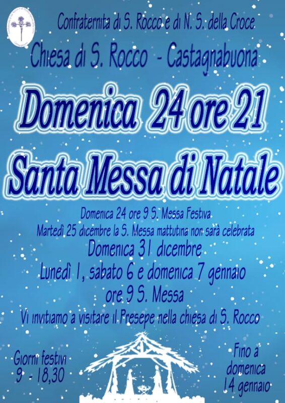 Domenica 24 dicembre alle ore 21 nell’Oratorio San Rocco sarà celebrata la messa della vigilia di Natale. Nelle domeniche e nei giorni festivi, esclusa la mattina di Natale, la celebrazione eucaristica sarà celebrata alle 9. Inoltre la confraternita invita a visitare il presepe allestito nell’oratorio e aperto al pubblico nei giorni festivi con orario continuato alle 9 alle 18:30 e nei feriali contattando i numeri di telefono 3492880216 e 335816609 oppure scrivendo un’e-mail a sanroccocastagnabuona@gmail.com.