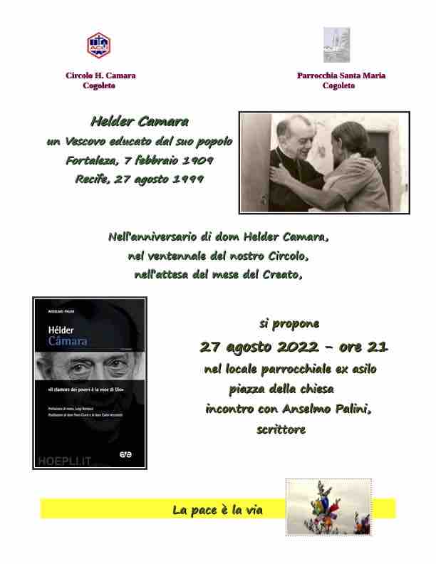 Cogoleto. Sabato 27 agosto alle ore 21 nei locali parrocchiali dell’ex asilo in piazza della Chiesa lo scrittore Anselmo Palini presenterà il suo nuovo libro “Hélder Câmara – ‘Il clamore dei poveri è la voce di Dio'”, ritratto di una tra le figure più importanti della Chiesa universale e della società del secolo scorso, in occasione dell’anniversario della sua morte e nel ventennale del circolo ACLI a lui intitolato e in collaborazione con la Parrocchia Santa Maria Maggiore.