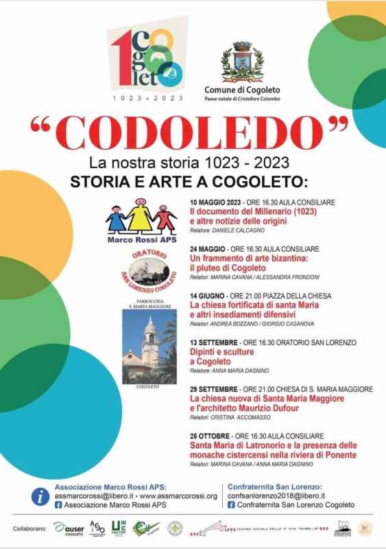 Cultura e arte a Cogoleto con il ciclo di conferenze “Cogoledo. La nostra storia 1023 – 2023”, che si terranno in concomitanza con il millenario della cittadina, citata in un documento del 1023 con l’antico nome di Codoledo. Gli incontri sono promossi da Comune, Associazione Marco Rossi, Oratorio San Lorenzo e Parrocchia Santa Maria Maggiore in collaborazione con AUSER, Associazione Culturale Cogoleto Otto, UniTre Arenzano – Cogoleto, CIF, Croce d’Oro, Centro Sociale della Terza Età “Isorella” e le associazioni Fornace Bianchi e Pratozanino 2.0.