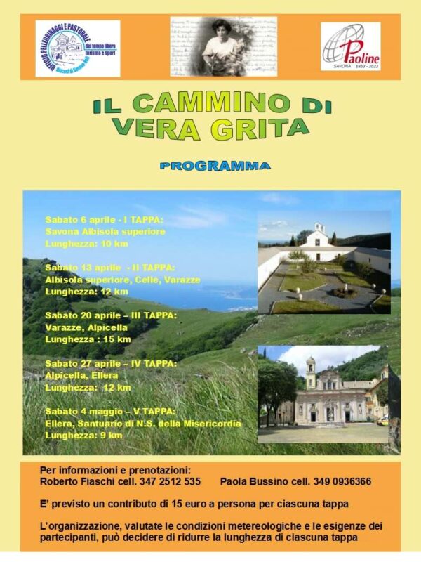Il Servizio Pellegrinaggi e per la Pastorale del Tempo Libero, del Turismo e dello Sport della Diocesi di Savona-Noli e la Libreria Paoline di Savona promuovono “Il Cammino di Vera Grita”, una serie di escursioni “sui passi” dell’insegnante di scuola elementare, salesiana cooperatrice e Serva di Dio, per la quale è in corso la causa di beatificazione.