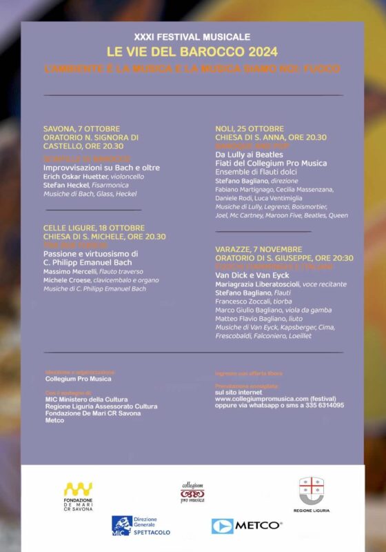 Venerdì 18 ottobre nella Chiesa San Michele Arcangelo a Celle Ligure nel concerto “Passione e virtuosismo di C. Philipp Emanuel Bach” si esibiranno Massimo Mercelli al flauto traverso e Michele Croese al clavicembalo e all’organo. Venerdì 25 ottobre nell’Oratorio Sant’Anna, in piazza Giuseppe Ronco, a Noli potremo ascoltare l’ensemble di flauti dolci di Collegium Pro Musica nello spettacolo “Da Lully ai Beatles”. Stefano Bagliano dirigerà Fabiano Martignago, Cecilia Massenzana, Daniele Rodi e Luca Ventimiglia nelle composizioni di Lully, Legrenzi, Boismortier, Joel, McCartney, dei Maroon Five, Beatles e Queen.