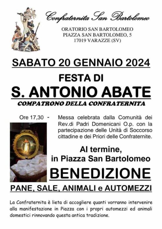 La Confraternita San Bartolomeo in Varazze onorerà il compatrono sabato 20 gennaio alle 17:30 con la funzione religiosa presieduta dai domenicani e a cui parteciperanno le unità di soccorso cittadine e i priori delle altre confraternite. Al termine in piazza san Bartolomeo la benedizione del pane, del sale, degli animali e degli automezzi. Anche a Spotorno nell’Oratorio Santa Caterina da Alessandria si celebrerà sant’Antonio con la benedizione degli animali.
