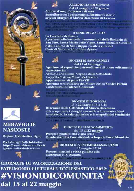 Le diocesi liguri proporranno il tema comune “Meraviglie nascoste”: ogni diocesi esporrà e mostrerà opere o luoghi non solitamente accessibili al pubblico. I visitatori potranno visitare una o più sedi aperte in via eccezionale e con mostre temporanee e scoprire le iniziative regionali tramite i social media e le altre forme di promozione. La Diocesi di Savona-Noli e il Complesso Museale della Cattedrale presenterà opere “nascoste” solitamente custodite nei depositi o tra gli scaffali dell’Archivio Storico, alcune conosciute solo da esperti e conservatori, altre totalmente inedite.