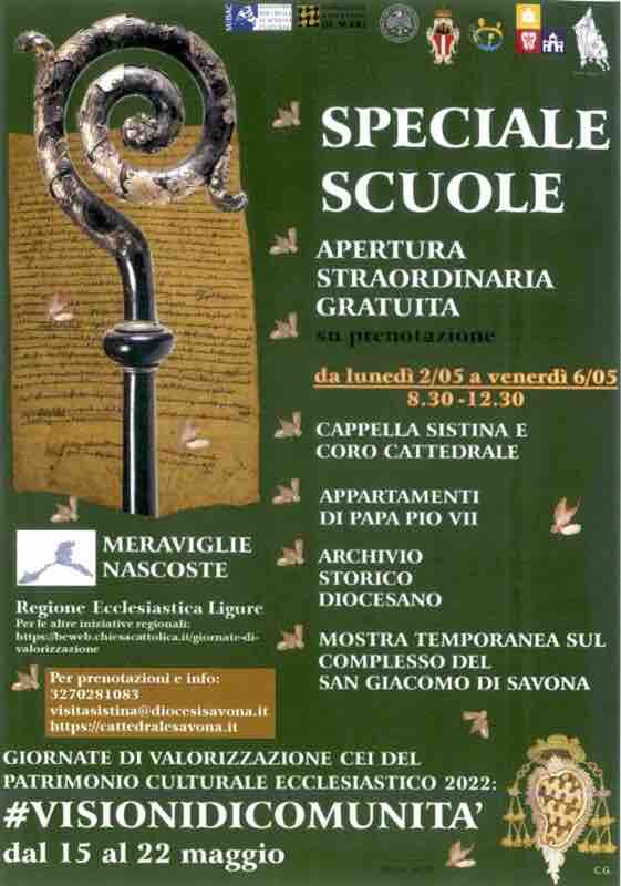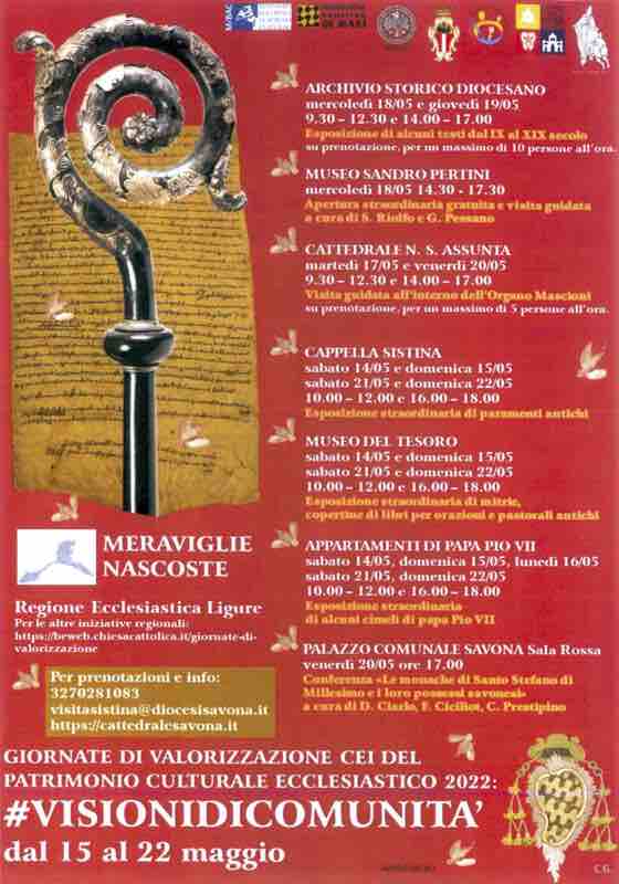 Le iniziative si terranno con il coinvolgimento dell’ Ufficio Beni Culturali diocesano, del Complesso Museale della Cattedrale, dell’Archivio diocesano e dell’Ufficio per la Pastorale Scolastica ma anche di diverse realtà e istituzioni, come il Comune di Savona, il Museo Civico “Sandro Pertini e Renata Cuneo”, la Società Savonese di Storia Patria, l’associazione Amici del Patrimonio Ecclesiastico, la Fondazione Agostino De Mari e i restauratori ICR. Alcune iniziative saranno ad ingresso libero, altre solo su prenotazione. Per informazioni e prenotazioni si può chiamare il numero di telefono 3270281083 oppure scrivere un’-email a visitsistina@gmail.com.