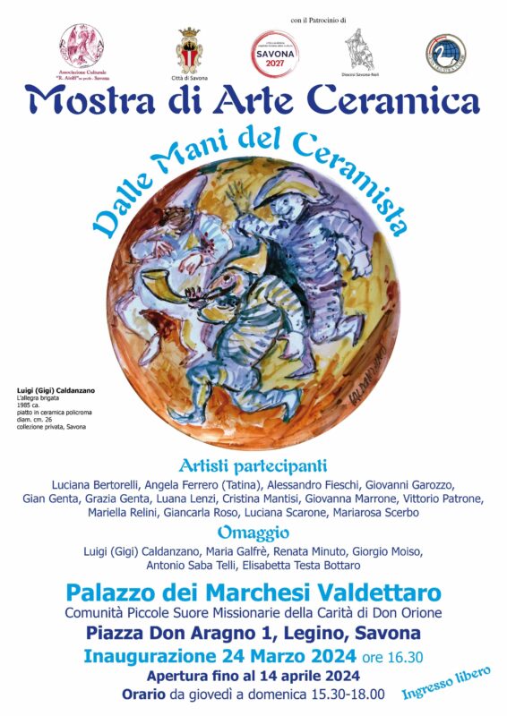 Savona. Con i patrocini della Diocesi di Savona-Noli, del Comune e dell’Associazione Liguri nel Mondo dal 24 marzo al 14 aprile nell’atrio di Villa Valdettaro, sede delle Piccole Suore Missionarie della Carità (Opera Don Orione), in piazza don Nicolò Aragno 1, nel quartiere Legino, è visitabile la mostra “Dalle Mani del Ceramista”, ideata e organizzata dall’Associazione Culturale “Renzo Aiolfi”. In esposizione due opere per ogni artista partecipante e alcuni omaggi a significativi artisti che hanno usato la ceramica con esiti originali: Luigi “Gigi” Caldanzano, Maria Galfrè, Giorgio Moiso, Saba Telli, Elisabetta Testa Bottaro e Renata Minuto.