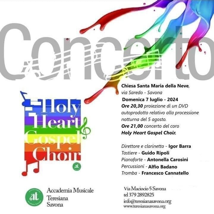 Domenica 7 luglio alle ore 21 nella Chiesa Santa Maria della Neve, in via Giuseppe Saredo, nel quartiere Fornaci, sarà in concerto l’Holy Heart Gospel Choir dell’Accademia Teresiana di Savona, diretto dal maestro Igor Barra. Lo spettacolo sarà preceduto alle ore 20:30 dalla proiezione di un video sulla tradizionale processione notturna della festa patronale parrocchiale del 5 agosto.
