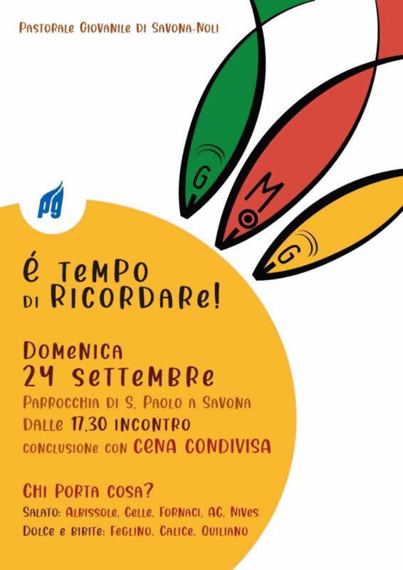Savona. Domenica 24 settembre dalle ore 17:30 presso la Parrocchia San Paolo Apostolo, nel quartiere Oltreletimbro, si terrà l’incontro “È tempo di ricordare”, organizzato dal Servizio per la Pastorale Giovanile della Diocesi di Savona-Noli e a cui sono invitati tutti i ragazzi e le ragazze, in particolare coloro che ad agosto hanno partecipato alla XXXVII Giornata Mondiale della Gioventù a Lisbona. L’iniziativa si concluderà con una cena condivisa.