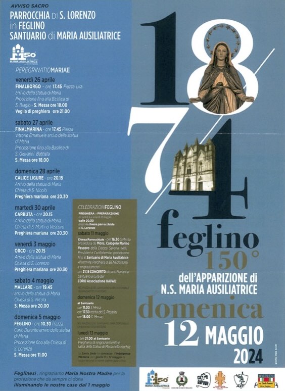 Orco Feglino. Il 12 maggio cadrà il centocinquantesimo anniversario dell’apparizione della “Madonna del Prà” (1874). Per onorare tale ricorrenza la Parrocchia San Lorenzo in Feglino e il Comitato Festeggiamenti promuovono un fine settimana di appuntamenti. Sabato 11 maggio alle ore 15:30 in chiesa il vescovo Calogero Marino presiederà la messa solenne, a cui parteciperanno le confraternite e seguita dalla processione fino al Santuario Santa Maria Ausiliatrice, dove ci sarà la preghiera di benedizione. Alle 21:15 ancora al santuario l’Associazione Hapax eseguirà un concerto di canti mariani.