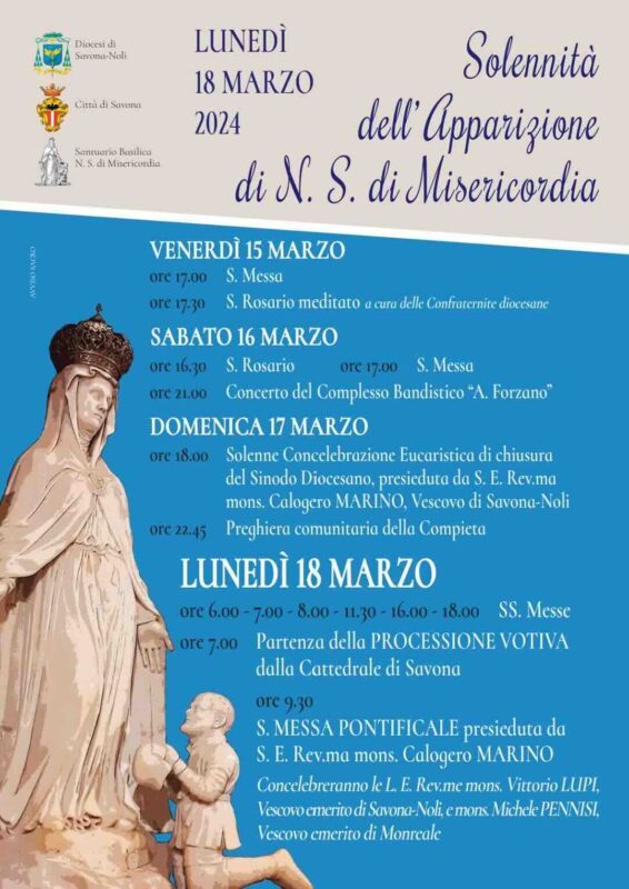 La diocesi di Savona-Noli si prepara a celebrare la festa patronale di Nostra Signora di Misericordia. La novità principale di quest’anno sarà la vigilia, scelta dal Vescovo come data di conclusione del Sinodo diocesano. La messa solenne sarà presieduta da monsignor Calogero Marino domenica 17 marzo alle ore 18 nel santuario mariano. Ciò comporterà una modifica al consueto programma: alle 17 non sarà celebrata l’Eucaristia e in serata non si svolgerà la veglia di preghiera. La basilica resterà aperta tutta la sera per le visite e il gesto del bacio del piede dell’effigie della Vergine nella cripta. La giornata della vigilia si concluderà con la compieta dalle 22:45.