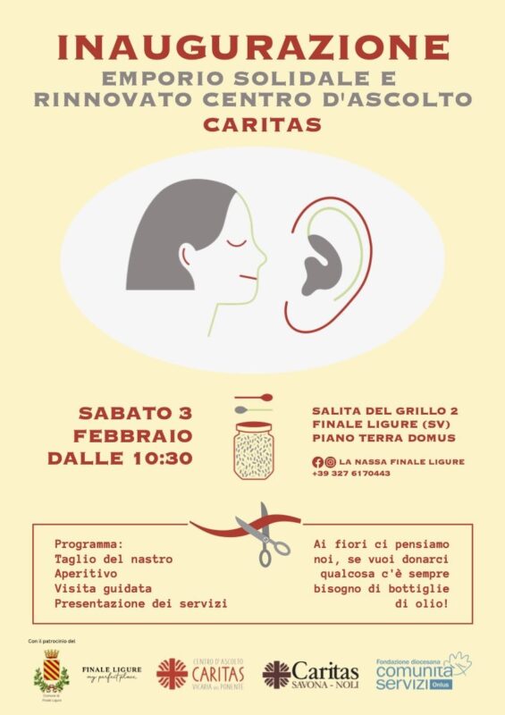 Finale Ligure. Sabato 3 febbraio alle ore 10:30 al piano terra della “Domus”, in salita del Grillo 2, avrà luogo l’inaugurazione dell’Emporio Solidale e del Centro d’Ascolto della Caritas, completamente ristrutturato. Dopo il taglio del nastro la mattinata proseguirà con un aperitivo conviviale, le visite guidate all’interno del centro e la presentazione dei servizi attivi sia storici sia nuovi.