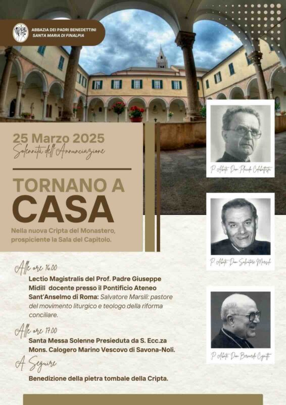 Finale Ligure. Martedì 25 marzo a Finalpia sarà una giornata di festa: all’interno della nuova cripta dell’Abbazia Santa Maria (prospiciente la Sala del Capitolo), in via Santuario, i Benedettini Sublacensi Cassinesi accoglieranno infatti le spoglie mortali degli abati Placido Colabattista, Salvatore Marsili e Bernardo Cignitti.