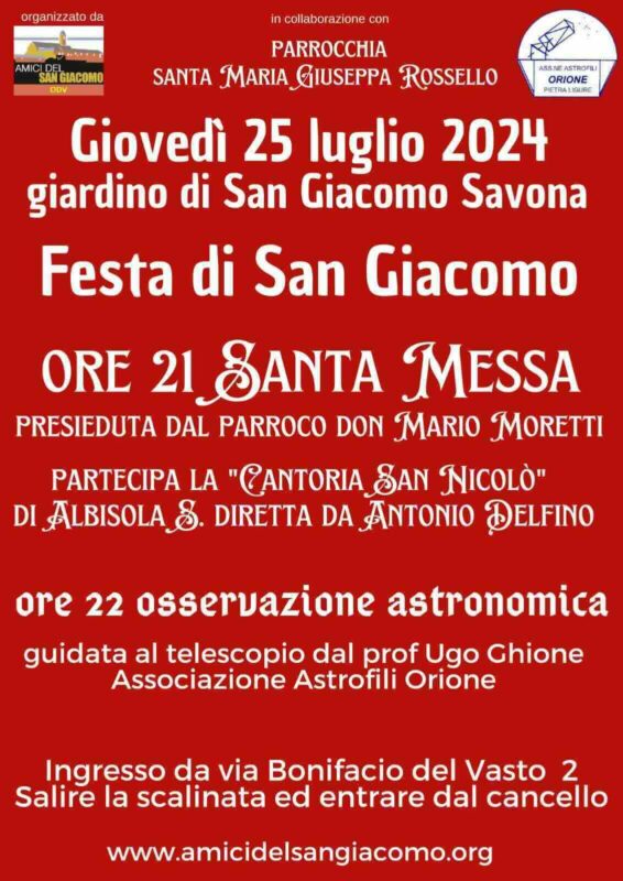 Alle ore 21 don Mario Moretti, parroco delle comunità Santa Maria Giuseppa Rossello e San Filippo Neri, presiederà la messa, animata musicalmente dalla Corale San Nicolò, diretta dal maestro Antonio Delfino. Alle 22 il professor Ugo Ghione dell’Associazione Astrofili Orione di Pietra Ligure guiderà un’osservazione astronomica mediante telescopio.